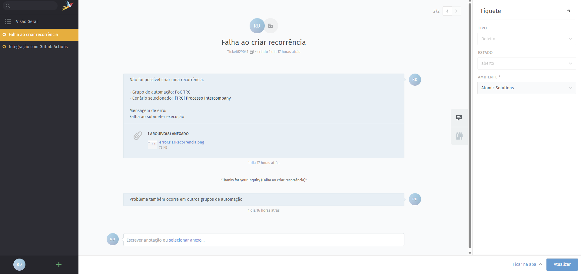 Clique no chamado para ver os detalhes e interações entre a equipe do Proton.